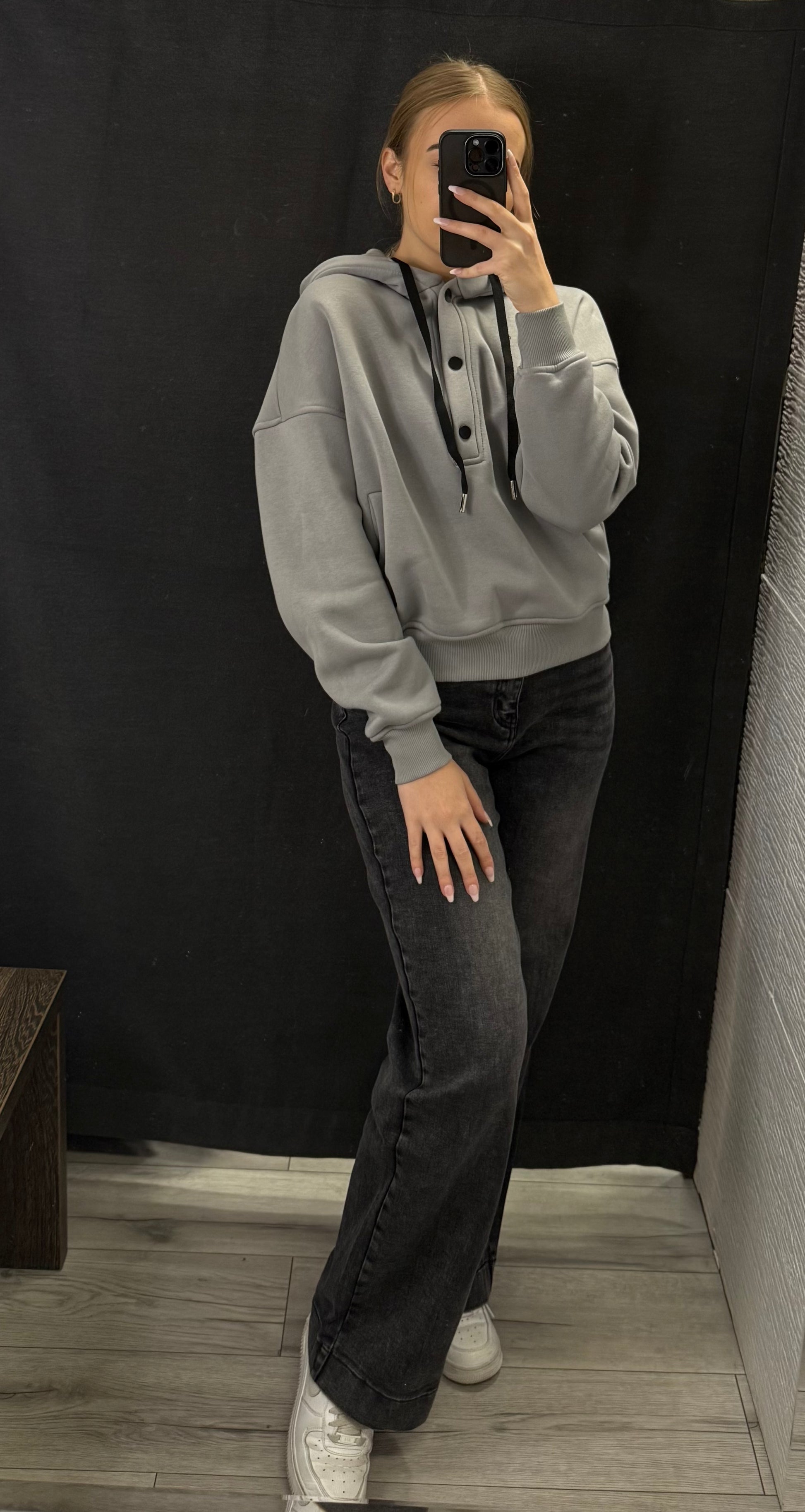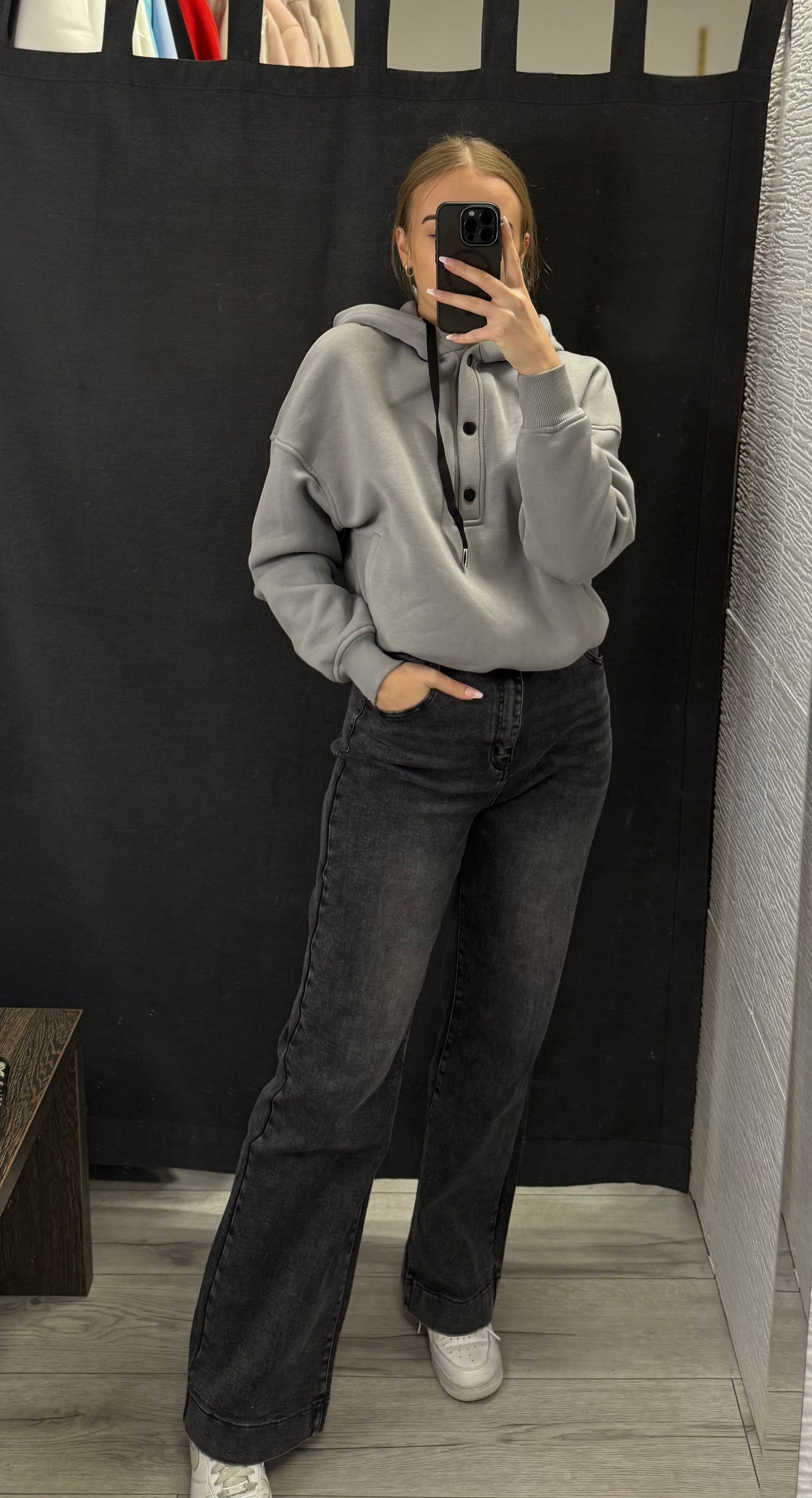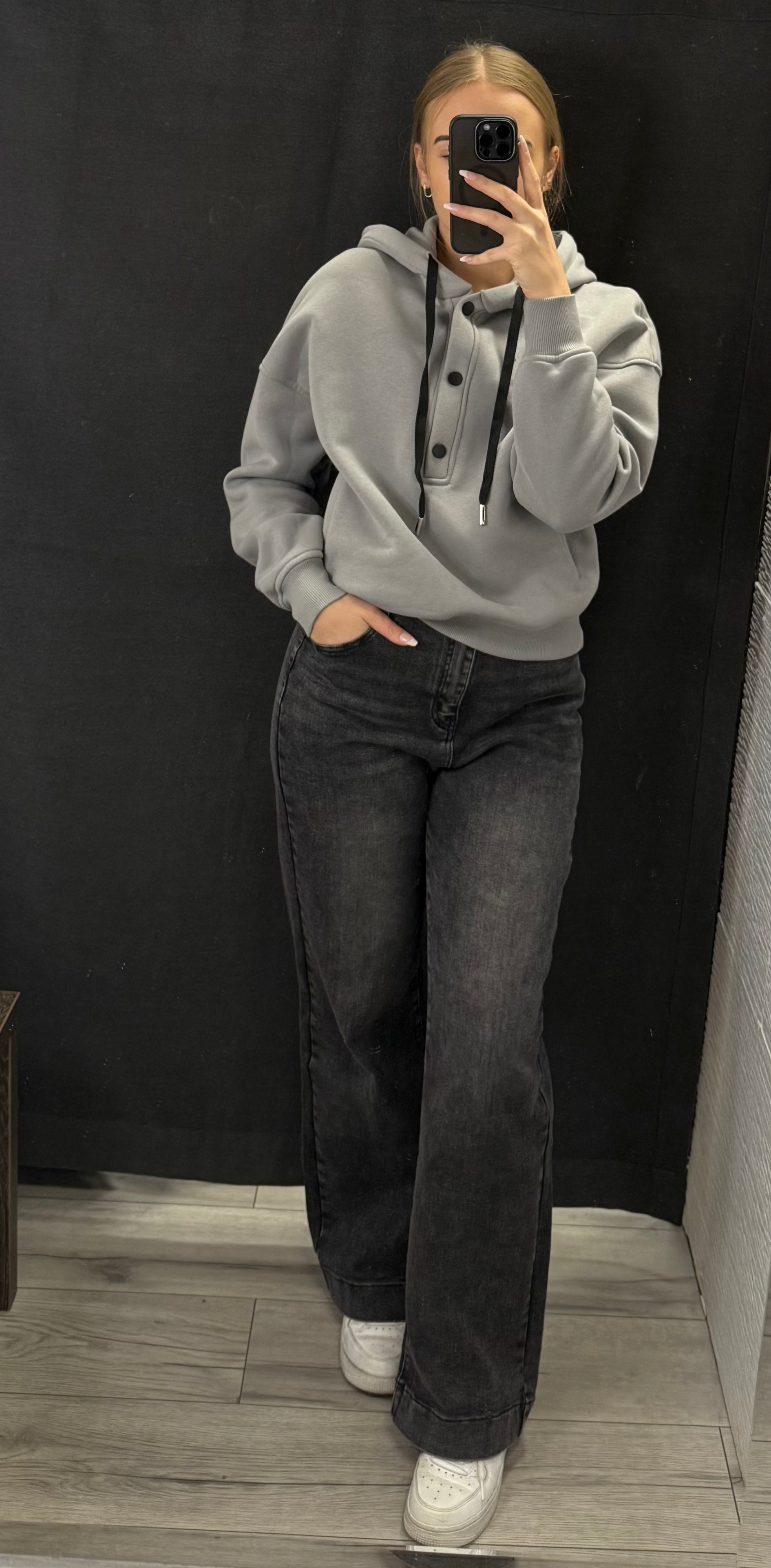 Grafitowe jeansy z szeroką nogawką